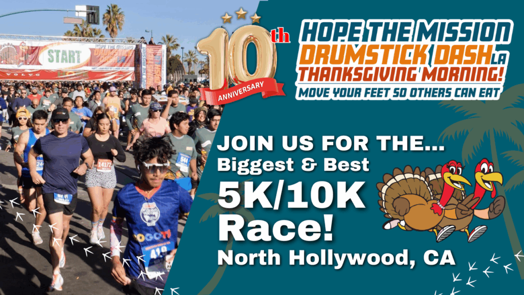 Be a part of the biggest Thanksgiving 10k/5k run in Los Angeles! Join us for the 10th year of Drumstick Dash LA as we raise funds for the individuals and families at Hope the Mission’s shelters. Spend your Thanksgiving morning with us in North Hollywood and help make this our biggest run yet!