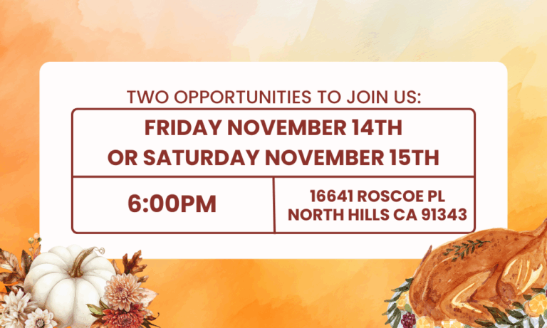 We’ll be serving a Thanksgiving meal with all the fixings! Bring a guest or two and enjoy an evening of fellowship and gratitude. We’re offering two opportunities to join us. Please RSVP through the form below by November 7 to reserve your spot.